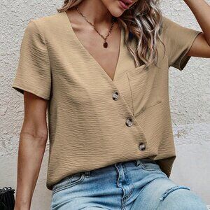 Khaki Womens Casual Solid Button Front Pocket Patched Blouse