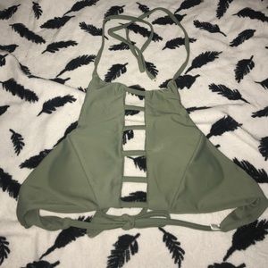 Khaki green swimsuit in a size small. Never worn because the top is too small so I would recommend anyone with a size smaller than a 34d. Adjustable strings on top. Also have in white