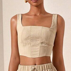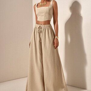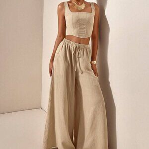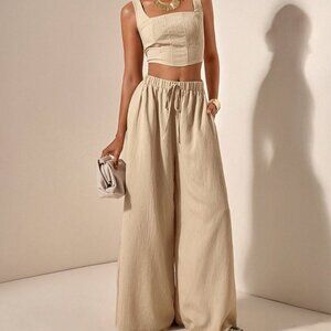 Khaki womens crop top & flowy wide legged pants textured fabric coord set