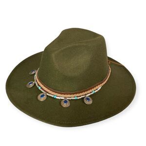 Bohemian western chic braided leather colorful coin, fringe hatband. Olive Green Fedora hat!