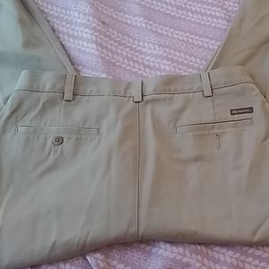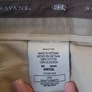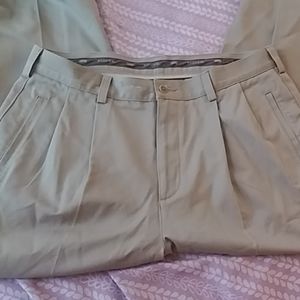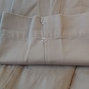 Front pleat khakis with two button closure back pockets. Size 34W 34L. Cuff at ankle was removed causing small damage on the right inside seam at the ankle (last pic)