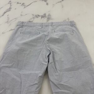 Khakis by Gap women's blue and white micro stripe broken in straight leg pant, size 2. They are free from any rips or stains. It measures about 32 inches around the waist, the inseam is about 25 inches and the rise is about 8 inches long.