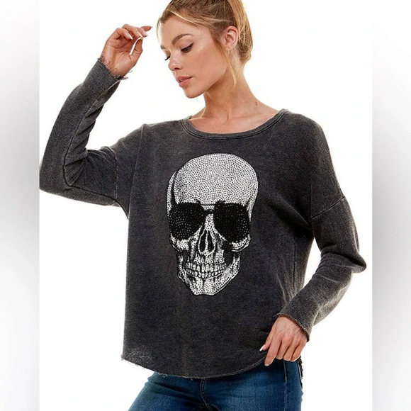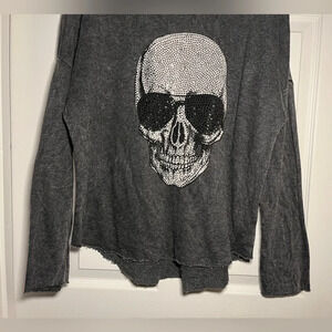 Khan Nara T-Party Medium Oversized Dark Grey Skull Raw Hem Long Sleeve Sweatshirt-Like New