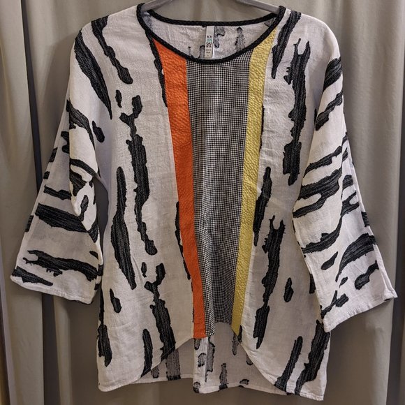 Khangura patchwork multi colored top - Wild Frolic Railroad. Pre-owned and still in great condition. 55% linen, 45% cotton with textured feel. Made in Los Angeles