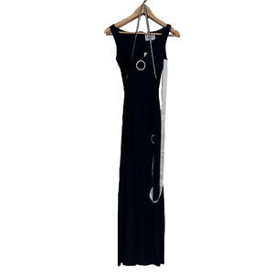 Khanum's x Revolve Koder Gown in Black. Size S / Small. Features fully lined, hidden back zipper closure, halterneck styling with rhinestone embellished strap and lobster clasp closure, rhinestone embellished ring at bust, jersey fabric with rhinestone embellished ring at side and side seam slit. 80% polyamide, 20% spandex. Style KR23-03. A couple tiny snags near chest area. NWT / New with tags.