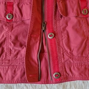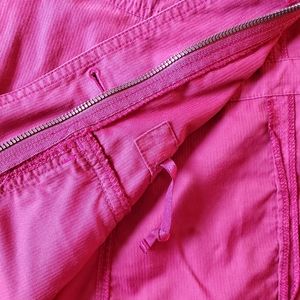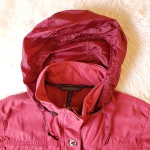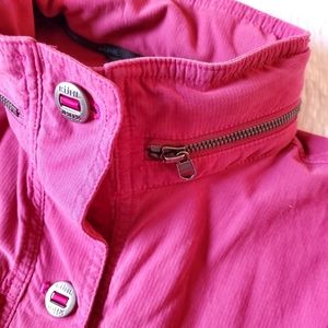 Hidden zipper hood, two-way zipper, pull inside waist and zipper/button pockets.