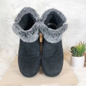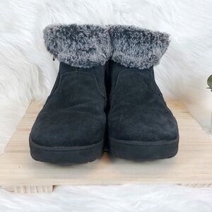 Khombu Jessica Suede Leather Memory Foam Boots. Fluffy Faux Fur Top Trim Side Zipper Closure Signature Pull Water Repellent Suede Leather Upper Black Fleece Lined Interior Thermolite Insulation to -20 Lightweight Winter Boots Memory Foam Insole for Comfort All Terrain K-Grip Traction Rubber Sole. Pre-owned condition, normal wear.