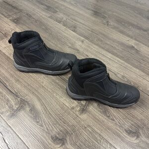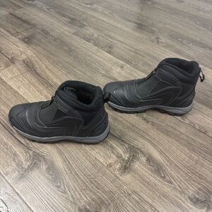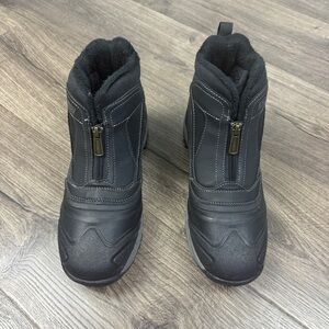 These Khombu Mason men’s hybrid winter boots in black feature a cushioned footbed, protective shell, and cozy faux fur lining to keep feet warm and supported. Designed with a durable outsole and front zip closure for easy wear and traction in winter conditions. Size 8, only worn once. Box included.