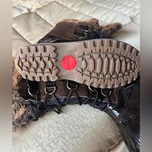 Khombu boots, Quechee Stingray, faux fur snow boots, women’s winter boots, brown waterproof boots, cold weather shoes, insulated winter footwear, lace-up snow boots, traction sole boots, après ski boots, cozy winter style, faux stingray texture, outdoor winter gear, warm fur-lined boots, winter fashion shoes, size 9.5