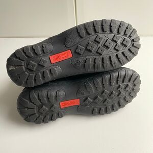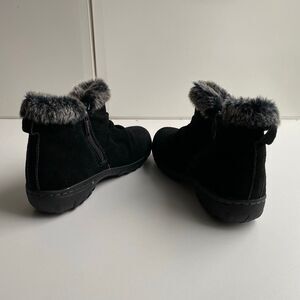 This is a pair of cute black leather ankle boots for women. They have faux-fur lining at the top of the boot and side zippers for easy taking off and putting on.
