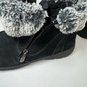 Khombu women’s Jessica black boots with faux fur trim. Size 8. Black with gray faux fur. Each boot has double zippers making them easy to slide on. Gently used in great condition.