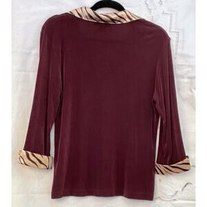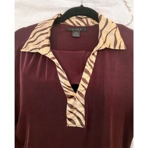 Elevate your travel or everyday wardrobe with this Kiara Slinky Stretch Pull On Pants/Top Set in Brown with satin contrasting collar and cuff. The set includes a pull over top with a collared neckline and long sleeves, paired with elastic waist pants .The contrasting animal trim adds a touch of elegance to the relaxed fit outfit, which is perfect for all seasons and easy to care for with its lightweight and non-iron material.