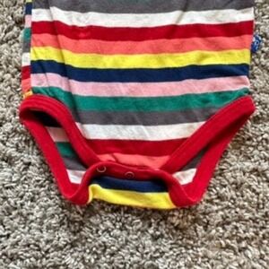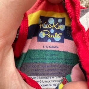 Keywords: KicKee Pants, baby bodysuit, long sleeve bodysuit, striped bodysuit, ruffle trim, baby clothes, 6-12 months, infant clothing, baby shower gift, multicolored, wrap bodysuit, baby girl, baby boy, unisex baby
