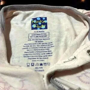 Soft, bamboo material with easy access button front and back door diaper openings! Gorgeous, classy ruffle appliqués down front and on back door diaper openings. 12-18 months.