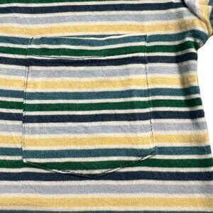This adorable polo shirt features a lightweight, silky soft bamboo material. it is a layered style polo with stripes in multi shades of blue, green and yellow on the shirt and solid sleeves. It has a collar and a small pocket on the front left side. Size 18-24m
