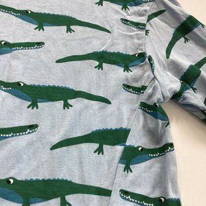 Light blue bamboo blend dress with alligator / crocodile print. Pockets. There is a little speck as shown in pictures. There are also wrinkles around the midsection which maybe look to be from line drying. Any questions, I'm happy to help!