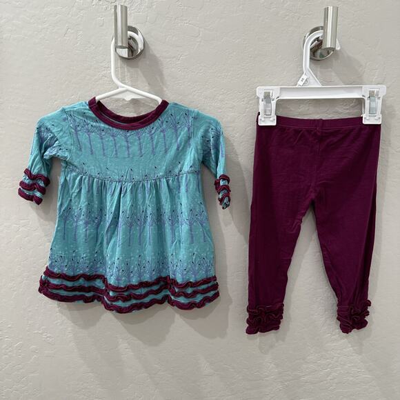 Kickee Pants long sleeve tunic top & leggings outfit size 12-18 months. Blue with purple trees and magenta burgundy ruffles paired with matching leggings with ruffles at ankles. Bamboo blend. Good condition for some fade and wash wear.
