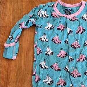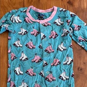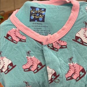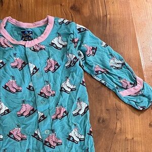 Adorable blue footie with pink And blue figure skates pattern. Features a fun pattern. Perfect for comfort and style. Very soft material. All the snaps work great.
