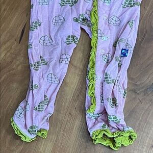 Soft pink bodysuit with green tree pattern. Ruffled edges add charm. Perfect for comfort and style.