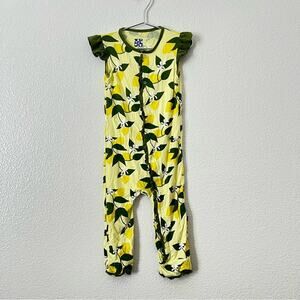 Kickee Pants Print Ruffle Tank Romper in Lime Blossom Lemon Tree yellow green, Size 4T. Snap button closure. Good used condition. Last photo is a stock photo to show fit and detail only.