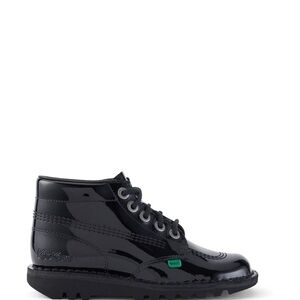 A must-have for the style-savvy kids of the 80s and 90s, the iconic Kick Hi stands the test of time. This classic ankle boot built around Kickers trademark chunky sole, brings their heritage DNA to an all-black patent leather. With their signature triple stitching, branded eyelets and comfortable padded collar, this classic silhouette gives you hard-wearing and standout style.