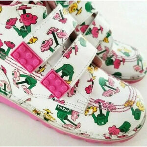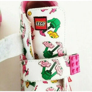 Lego flowers on white base - Rubber Lego block (3X2) on velcro straps & pink stitching detail