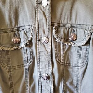 Great condition. Fast ship. Elevate your style with this women's Kickit jeans jacket in army green. This classic-fit jacket features long sleeves with button accents, a short length and a button closure. Made with cotton chambray fabric and spandex lining, this machine washable jacket is perfect for everyday wear.