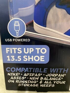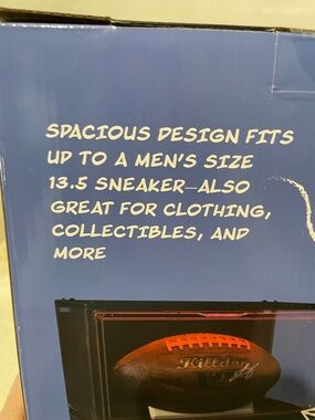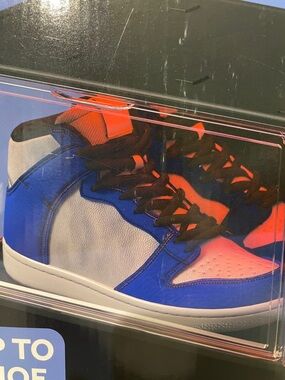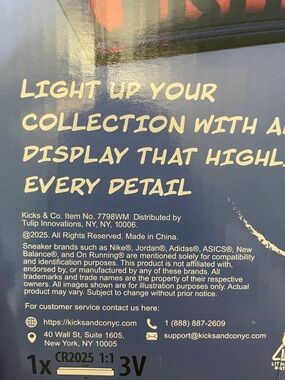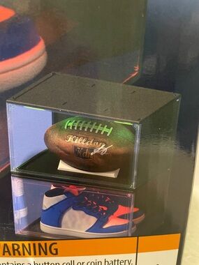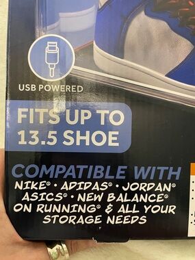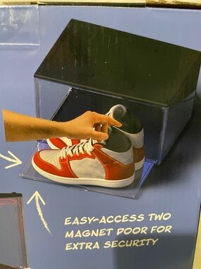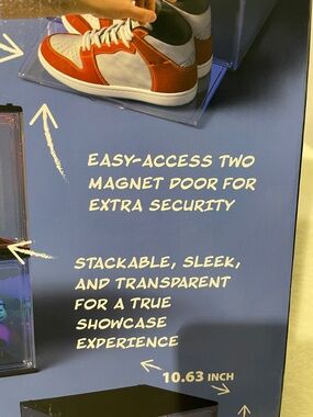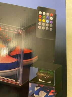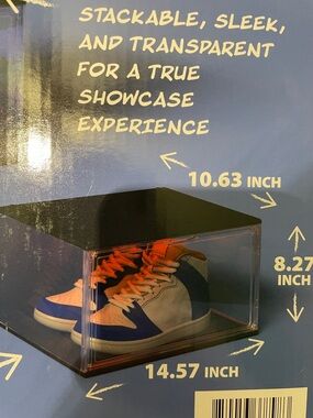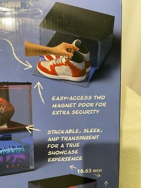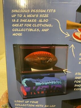 Stackable sneaker storage box with LED lighting. Clear front display with multi color packaging accents. USB powered with remote control. Fits up to 13.5 shoe. Clean, modern display case.