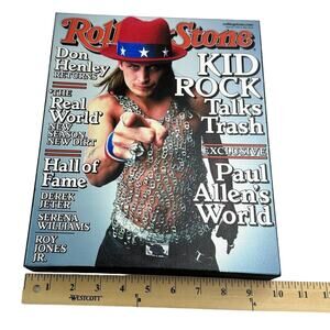 Item is like new. This stunning canvas print features Kid Rock on the cover of Rolling Stone magazine. The high-quality reproduction of this iconic image is perfect for any music lover or fan of Kid Rock. The print is made on durable canvas material and is ready to hang in your home, office, or dorm room.