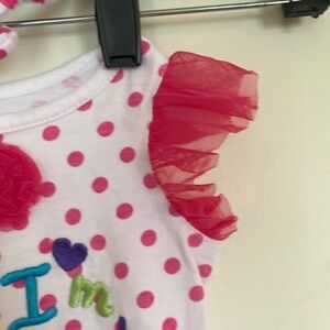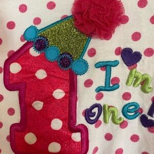 Celebrate your little one year olds birthday with this adorable kid Topia, 9/12 month onesie, white with pink polkadots pink ruffles hundred percent cotton with matching hat. This is so cute washed and Warren one time. Thanks for looking. Happy shopping.