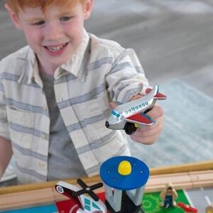 The KidKraft Waterfall Mountain Train Table Set is perfect for little conductors. With 120 colorful pieces, kids will love the adventure of pushing the train around and through a gentle waterfall and over a suspension bridge. A crane lifts and lowers cargo onto the train and a helicopter soars over the town with blades spinning. When it's time to clean up, the whole set fits into convenient removable storage bins.