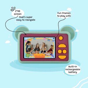 Digital camera for kids 4-6, very good used condition. No scratches, still has protective film on the screen. Includes options for cute frames while taking photos. Easy for kids to use, the strap is the charger/usb port to transfer photos. Can also take videos. Up to 12MP* photos, 1440 x 1080 videos.
