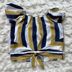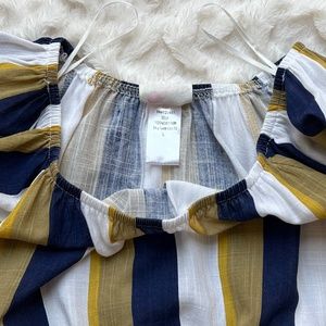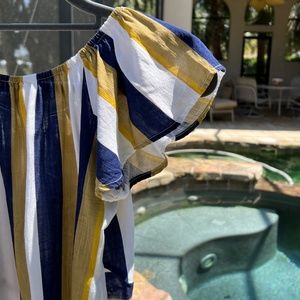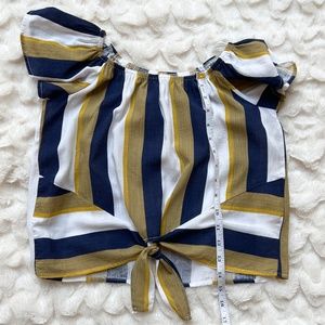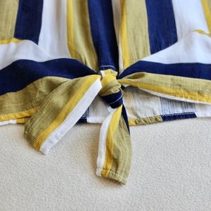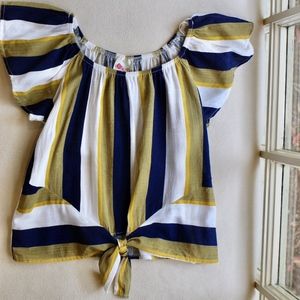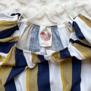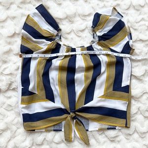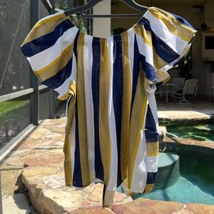 Striped 100% cotton flutter sleeve top with elastic scoop neck.