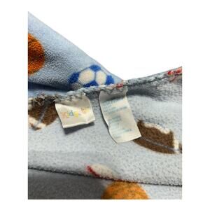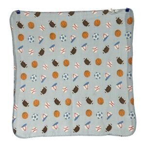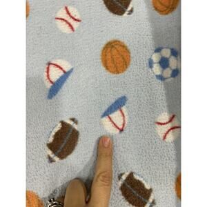Blue sports ball themed baby blanket with stitched edge from brand Kidgets. Preowned in good condition. No holes or tears. Has a few light stains. Has been laundered but not stain treated.