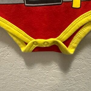 Charming red onesie with bright yellow trim. Perfect for little ones.