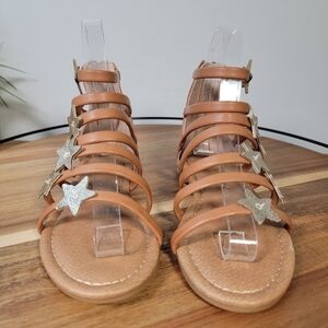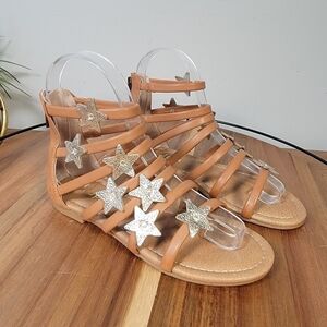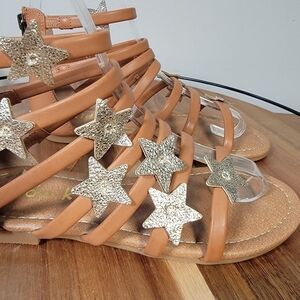 adorable Strappy faux leather gladiator sandals with gold star decorations. Open Toe. Back zipper. Cushioned footbed.