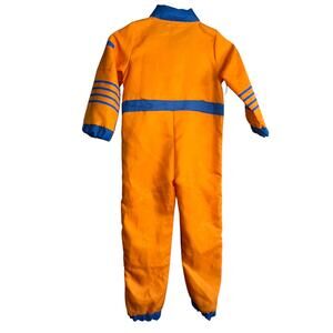 Kids astronaut space suit costume in bright orange and blue. Features fun space patches, mock belt detail, elastic cuffs, and full-length jumpsuit style. Perfect for Halloween, dress-up, school events, or imaginative play.