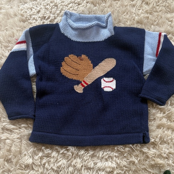 This charming kids' sweater features a playful baseball theme, perfect for little sports fans. Crafted in navy and light blue, it's both cozy and stylish.