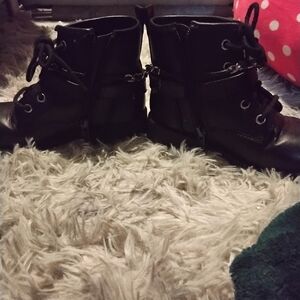 Stylish black leather boots featuring a bold chain detail. Perfect for adding an edgy touch to any outfit.