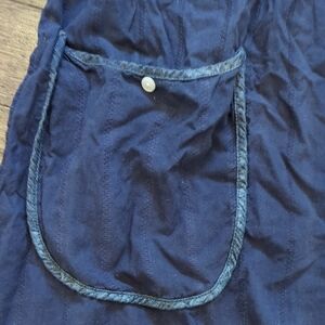 Elegant blue apron with a stylish Eiffel Tower detail. Features two handy front pockets. Ideal for kitchen or craft use.