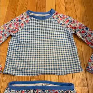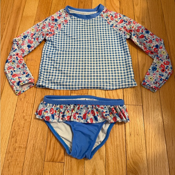 Long-sleeve rash guard with blue gingham body and floral sleeves. Matching blue bikini bottom with floral ruffle waist. Soft, quick-dry fabric for sun protection and comfortable wear. Includes blue and floral color details. Size 5t. In great condition.