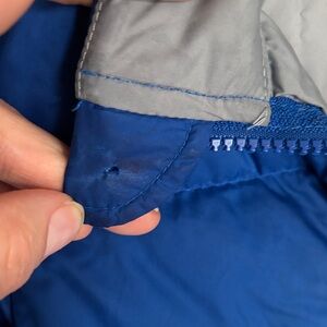 Warm and stylish puffer for kids. Features a vibrant blue exterior with a cozy gray lining. Ideal for cold weather. 3T. One tiny hole on the inside flap (shown in picture).