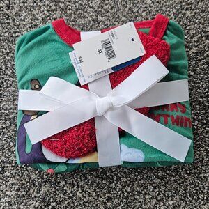 This is a 3T Holiday 3pc pajama and socks set featuring everyones favorite dog Bluey! Geared toward boys but girls like Bluey too! 100% polyester, flame resistant cozy fabric. See pictures for details since I cannot unwrapped it to photograph it. NWT.