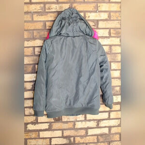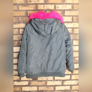 super cute puffer jacket with faux fur hot pink trimmed hood. great condition. the only flaw is shown in photo #5 & the last- there is a tiny bit of wear near the pocket. Unnoticeable unless you're really looking for it!