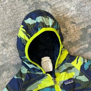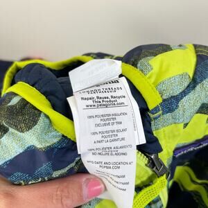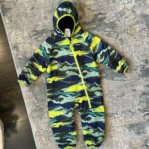 Keep your little one warm and stylish with this camo hooded jacket. Featuring a vibrant mix of blue, green, and yellow, it's perfect for outdoor adventures.