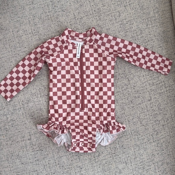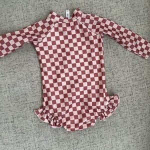 Charming pink checkered rashguard for kids by Ruffle Butts. Perfect for sunny adventures, offering both comfort and style.