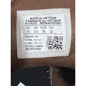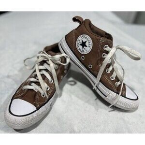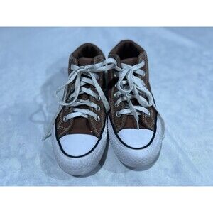 The Kids Converse Chuck Taylor All Star Malden Street Mid Brown shoes in size 4 are a stylish and comfortable choice for boys. These lace-up sneakers feature a classic round toe shape, standard shoe width, and rubber outsole for durability. The brown color and star theme make them fun and trendy for everyday wear. Made with canvas lining and Converse brand quality, these athletic shoes are sure to be a hit with any young fashionista. Made in Vietnam as part of the Converse All Star product line, these shoes combine timeless style with quality craftsmanship.