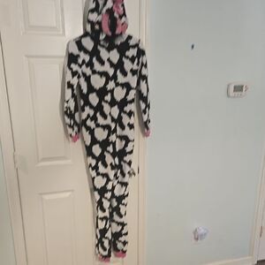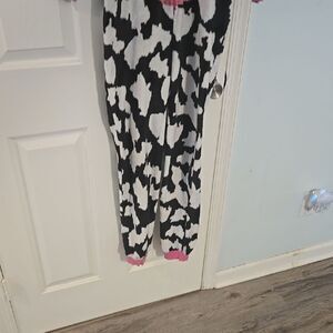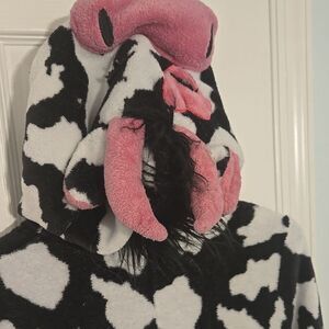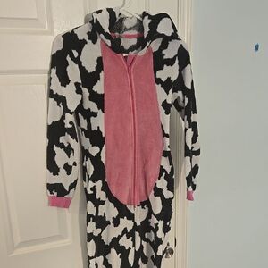 Cozy and fun cow print pajamas for women or girls with vibrant pink accents. Perfect for bedtime adventures.