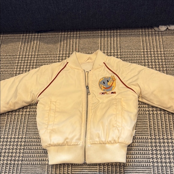 Stylish cream jacket for kids featuring a fun embroidered patch. Perfect for keeping your little one warm and trendy.