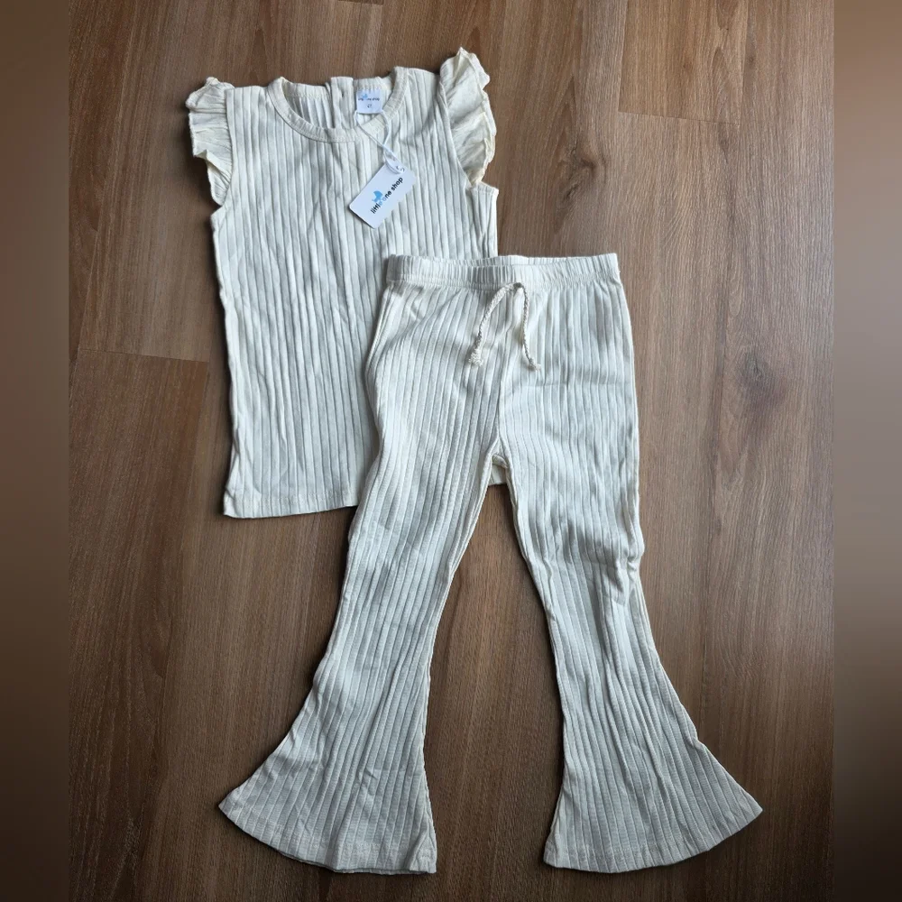 Adorable cream-colored kids set featuring a ruffle sleeve top and matching bottoms. Perfect for stylish comfort. new with tags.
